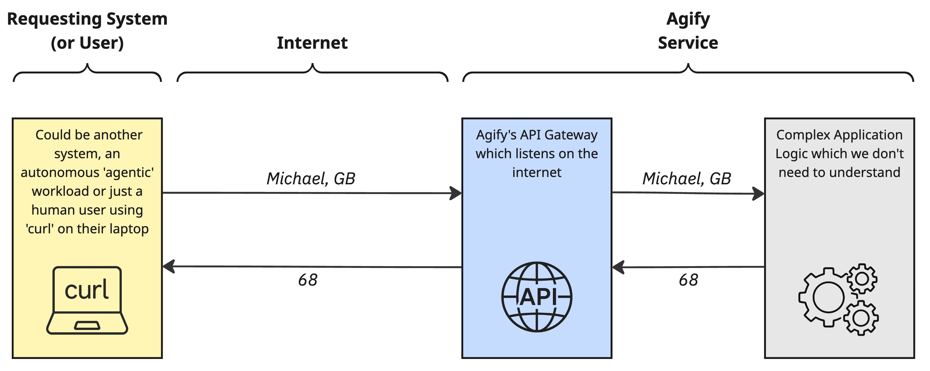 In this diagram, the caller (yellow box) sends the request to the agify API with specific query parameters. The API (blue box) receives it, sends it to the back-end application (grey box), and returns a structured response when it receives one from the application. This is the “contract” that was mentioned earlier, in action.